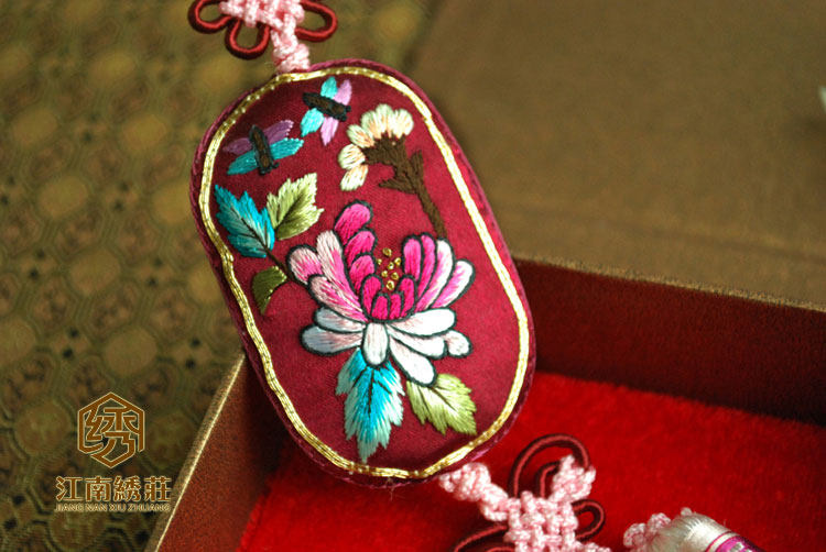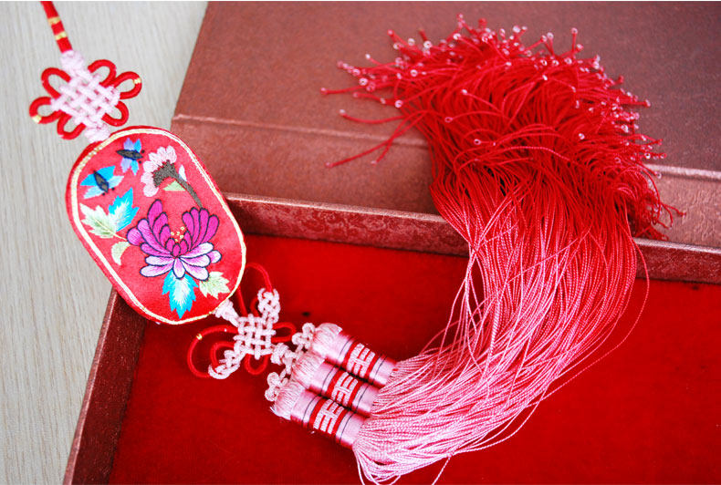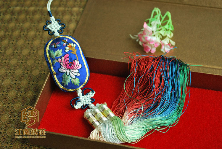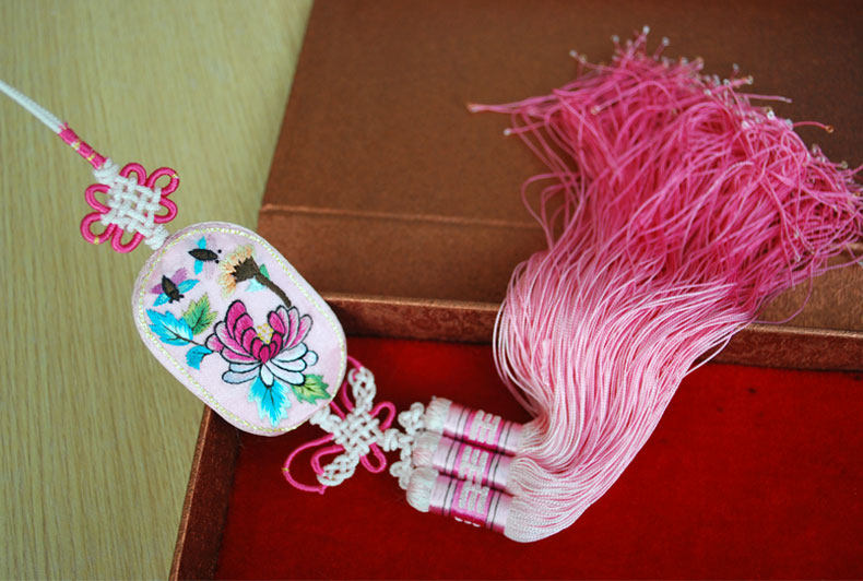 这款手工刺绣挂件,刺绣面边框运用金线盘金刺绣、中间用彩色桑蚕丝线刺绣,纯手工做工精致,风格华贵典雅,配上根据冷暖主色调搭配手工编织的中国结艺和渐变的流苏吊坠具有浓厚的中国特色传统文化。